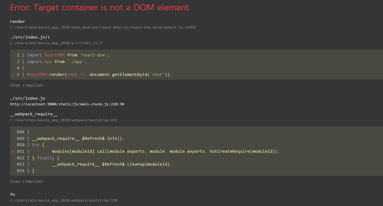 'root인 엘리먼트를 찾는데 public에 있는 index.html에 아이디가 'root'인 엘리먼트가 없기때문이다.