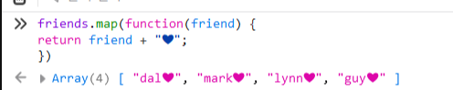 그 원소에 하트를 붙여 반환하니까 [ "dal❤", "mark❤", "lynn❤", "guy❤" ] 을 얻을 수 있다.
