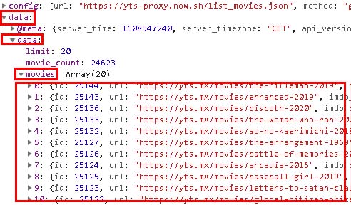 data -> data -> movies 순서로 객체에 접근하면 데이터 추출 가능.
