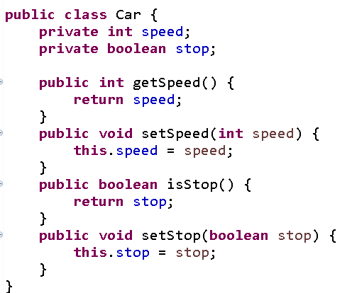 setSpeed와 setStop을 추가해준다. (매개변수는 필드의 타입과 변수를 동일하게 쓴다.)