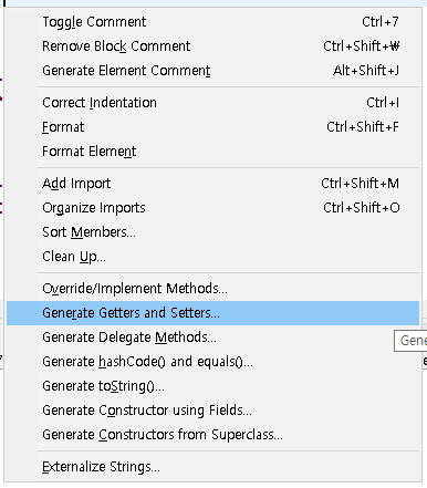 2. alt + shift + s 눌러서 아래 사진과 같은 Generate Getter and Setter... 를 클릭한다.