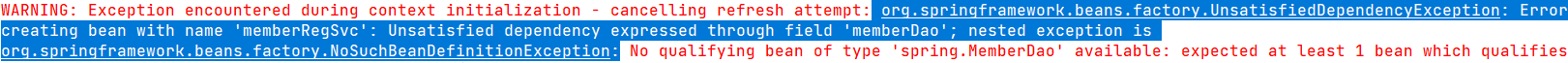 MemberDao빈이 존재하지 않아 ChangePasswordService빈을 생성할 수 없음