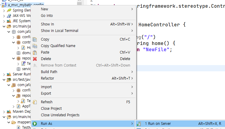 만든후 프로젝트에서 우클릭 Run As -> Run on Server로 실행하기